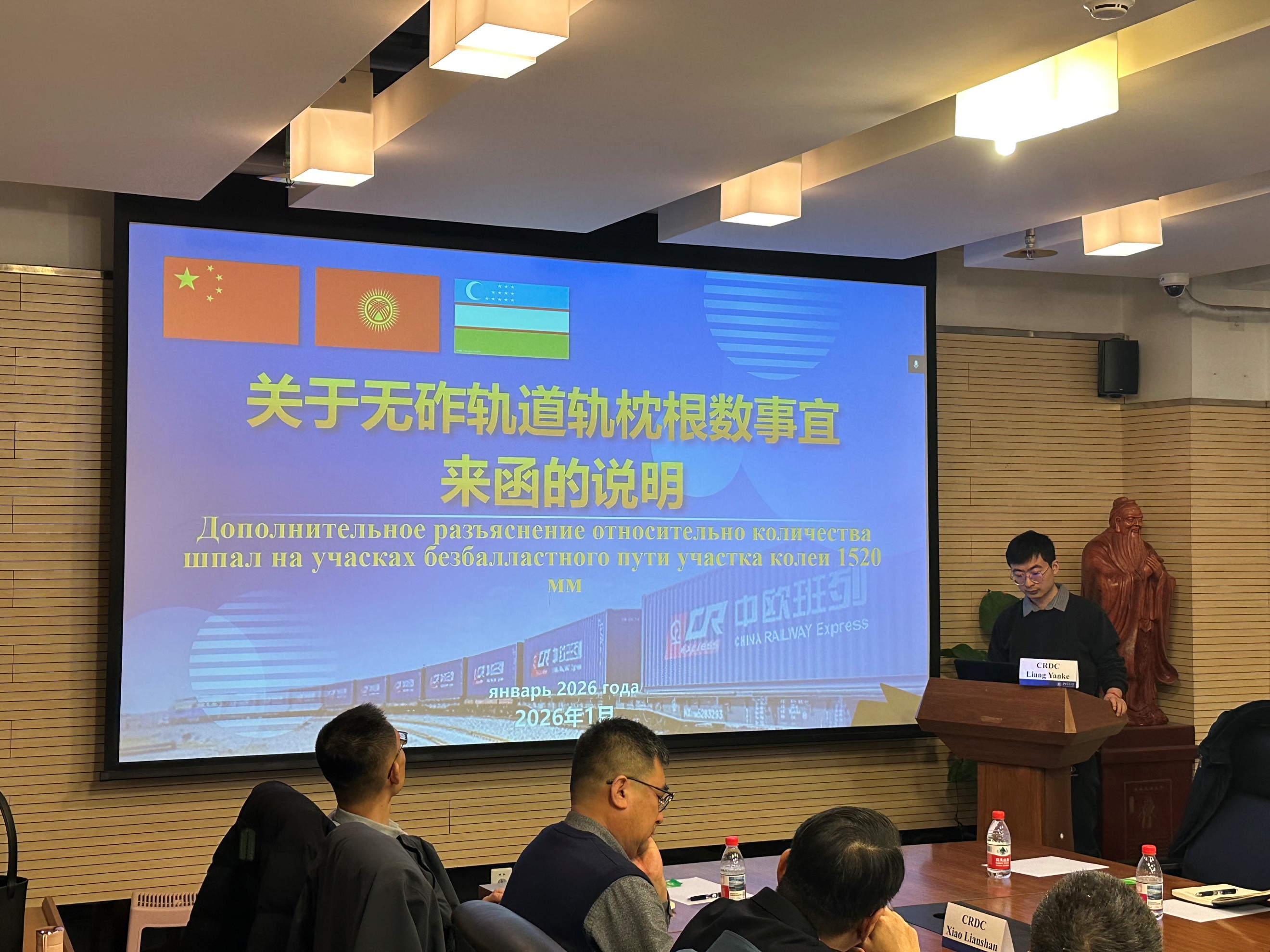 随后,中国铁设中吉乌铁路轨道专业负责人梁延科作了题为《关于无砟轨道轨枕根数事宜来函的说明》的专题汇报。汇报结束后,与会人员聚焦采用中国无砟轨道标准体系核心议题,围绕相较于吉尔吉斯斯坦现行标准进行轨枕根数优化调整后,轨道结构的受力性能变化、长期运营安全性以及全生命周期经济性测算等关键问题,展开了深入、务实且富有建设性的技术讨论。会议现场交流充分,讨论热烈,为推进中吉乌项目技术方案的进一步优化与共识的形成奠定了坚实基础。